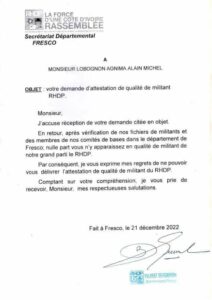 La demande de M. Lobognon a été purement et simplement rejetée par le RHDP, indique la note. Il ressort qu’après vérification, le concerné n’apparait nulle part comme militant dudit parti.