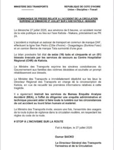 Un grave accident de la circulation survenu le dimanche 27 juillet 2025, aux environs de 6h, au point kilométrique 24 de l’axe Katiola–Niakara (Nord), a fait 16 morts et 51 blessés, a appris ICI1FO d’un communiqué du ministère des Transports.