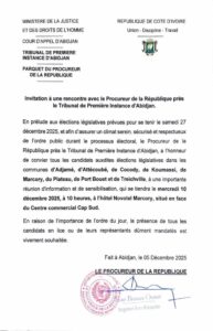 À l’approche des élections législatives prévues pour le 27 décembre 2025 en Côte d’Ivoire, M. Koné Braman Procureur de la République près le Tribunal de première instance d’Abidjan, a annoncé la tenue d’une rencontre d’information avec les candidats du district d’Abidjan.