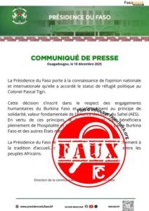 Un faux communiqué attribué à la Présidence du Burkina Faso circule actuellement sur les réseaux sociaux. Il affirme que le lieutenant-colonel Pascal Tigri, impliqué dans le coup d’Etat déjoué au Bénin, le 07 décembre 2025, aurait obtenu l’asile politique au Burkina Faso.